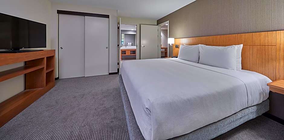 This accessible suite features separate sleeping and living spaces, along with a partial kitchen. Additional amenities include closed-caption TV, various lowered features, and wider bathroom doors.